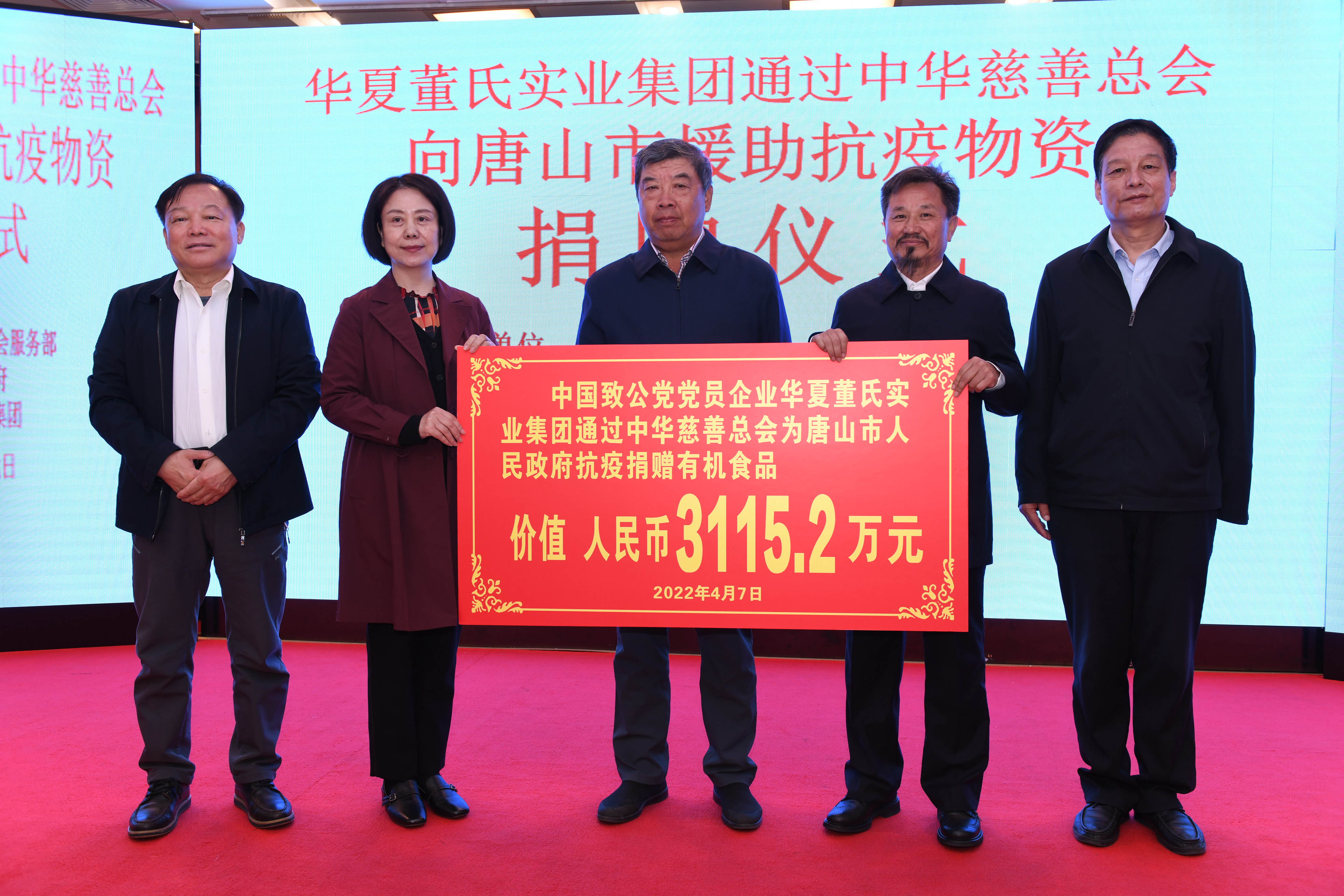 人民政协网北京4月7日电(记者 舒迪) 4月7日,华夏实业董氏集团通过中华慈善总会支援唐山市抗击疫情捐赠仪式在北京唐山大厦举行。中华慈善总会副会长孙少华,中华慈善总会秘书长边志伟,中国致公党中央委员会社会服务部部长马传凯,唐山市委副秘书长、唐山市人民政府驻北京联络处主任訾惠,第十二届全国政协委员、华夏董氏实业集团董事局主席董配永,华夏董氏实业集团总经理董菁等出席捐赠仪式。