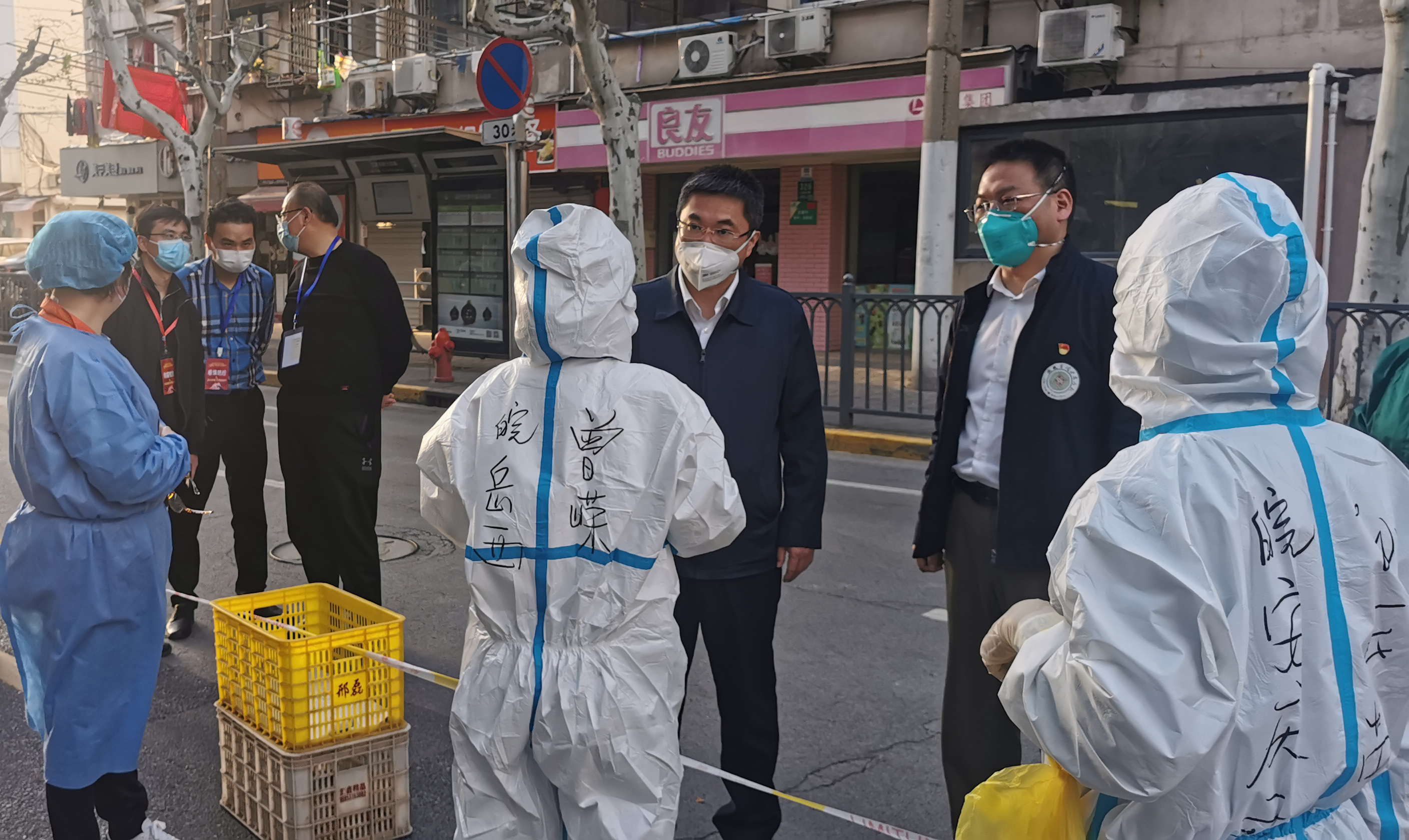 4月4日,邵东华(左二)带领院感专家组在徐汇区所属街道采样巡回点