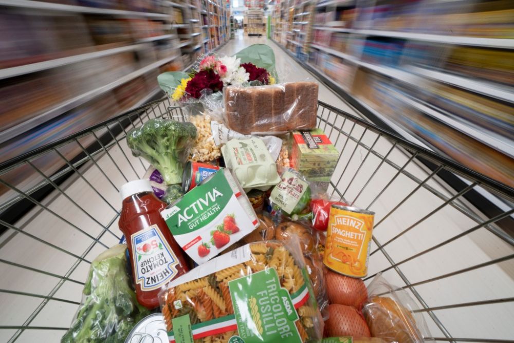 这是4月13日在英国曼彻斯特一家超市内拍摄的购物车。新华社发(乔恩·休珀摄)