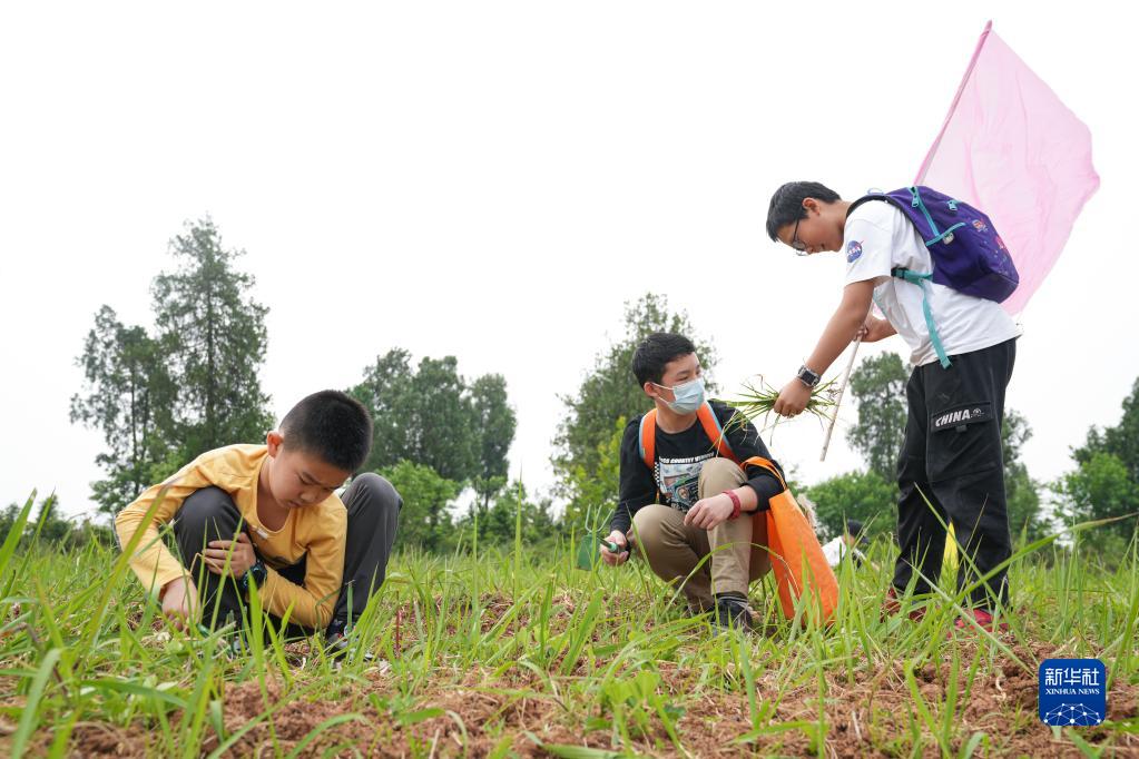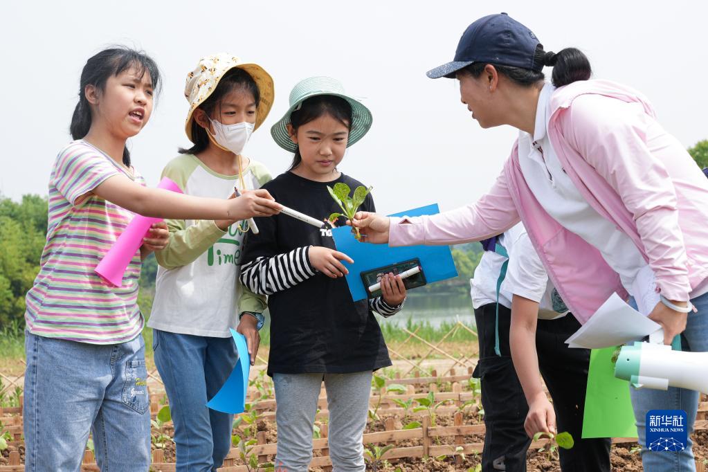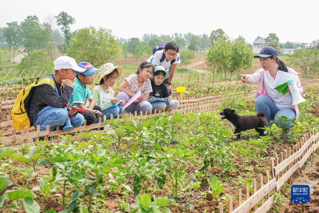 5月15日,在合肥市蜀山区南岗镇“依依田园”,孩子们在老师的指导下认识农作物。