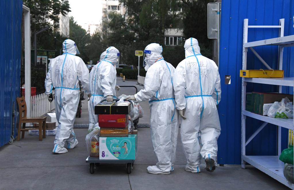 5月15日,在北京市海淀区中关村街道三才堂水清木华园小区设置的缓冲区,工作人员准备为小区居民运送订购的物资。(新华社记者任超 摄)