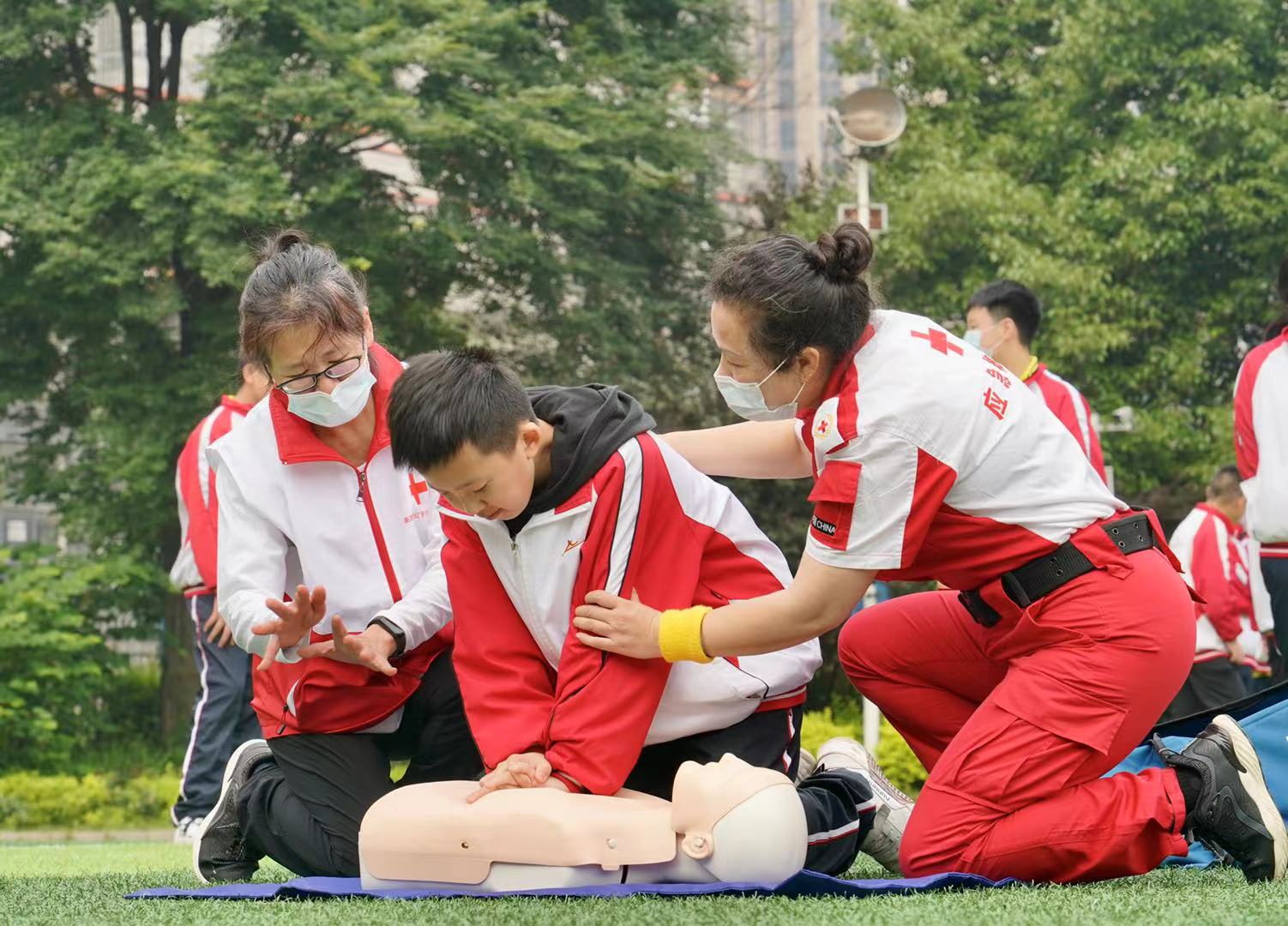 活动当天,学校高年级的同学们在红十字志愿者指导下学习心肺复苏、气道异物梗阻及防溺水手指操等急救知识和技能并进行实操演练。