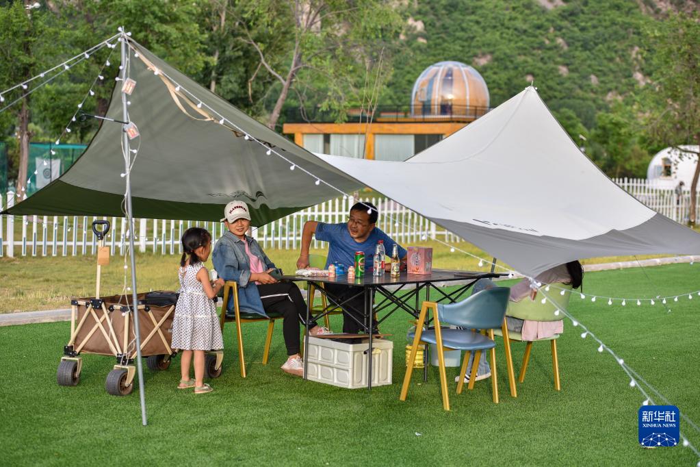 游客在河北省涉县太行红河谷一处房车露营地露营(5月29日摄)。