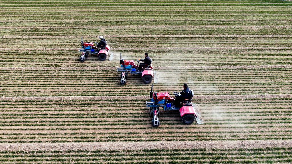 2月17日,在山东省聊城市莘县妹冢镇,农民在麦田里进行镇压保墒作业。新华社记者郭绪雷 摄