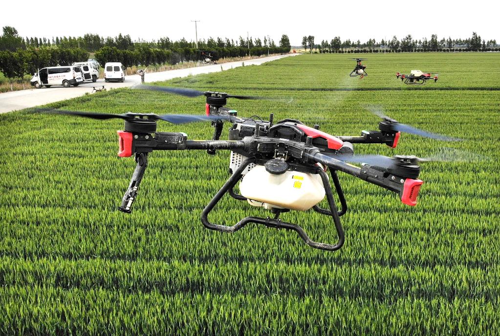 装机、灌药、起飞,几架直径一米左右的无人机在技术人员操控下盘旋爬升、空中悬停、匀速前行,雾化药肥混合剂均匀地洒在麦苗上,仅用1分钟就完成了1亩农田的植保任务。