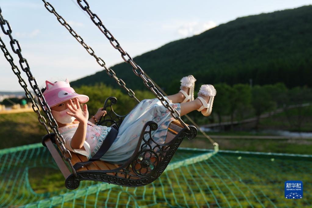 6月8日,小朋友在爱情谷主题公园荡秋千。