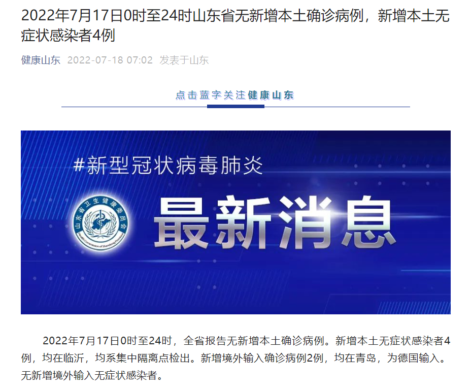 2022年7月17日0时至24时山东省无新增本土确诊病例,新增本土无症状感染者4例