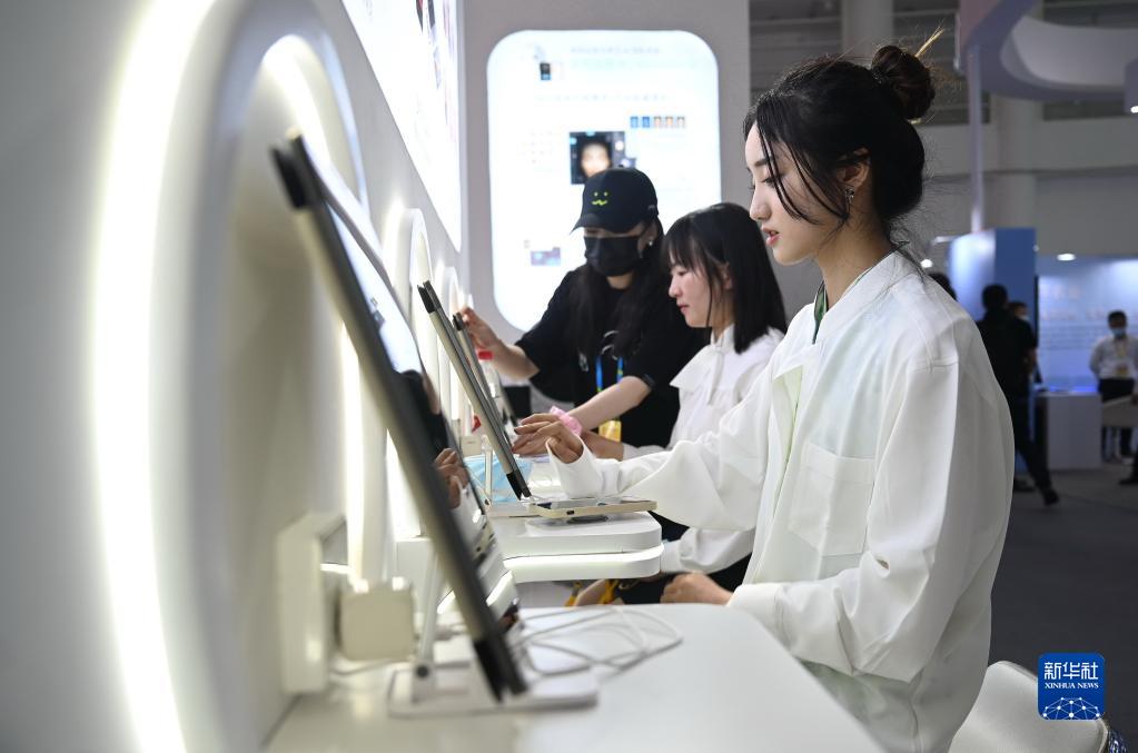 7月22日,参观者在第五届数字中国建设成果展览会上体验虚拟试妆。 新华社记者 林善传 摄