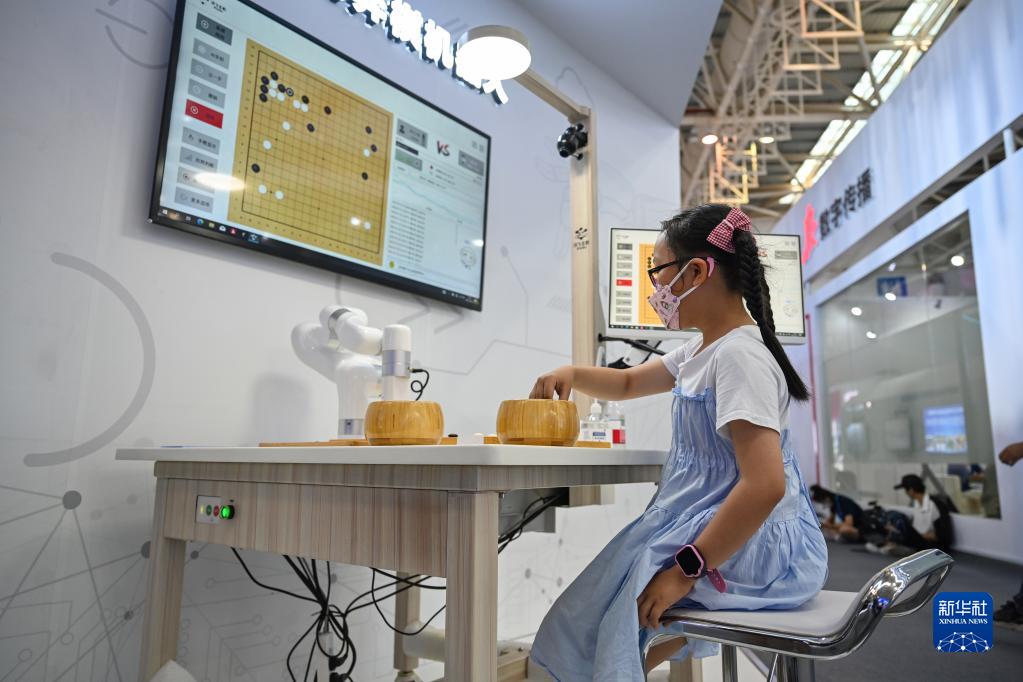 7月22日,小朋友在第五届数字中国建设成果展览会上和AI机器人下棋。 新华社记者 周义 摄