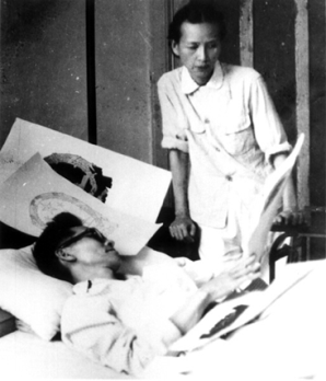 梁思成在病床上和林徽因研究国徽方案
