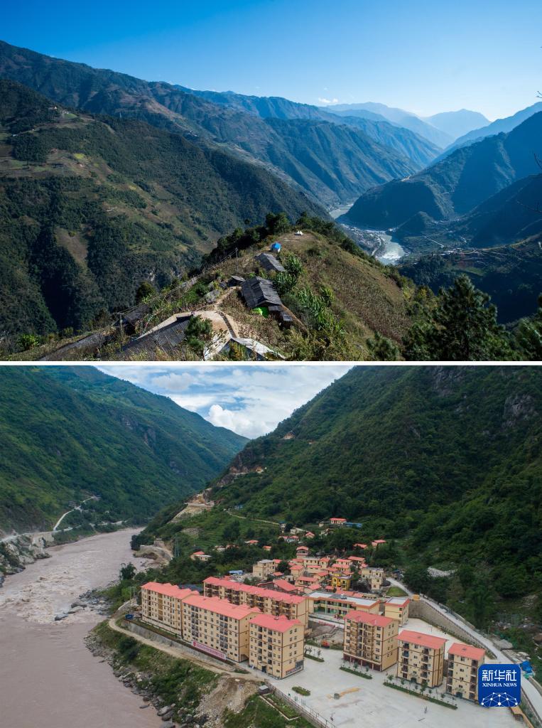 拼版照片:上图是云南福贡县匹河乡托坪村一景(2016年11月25日摄);下图是搬迁到怒江边的托坪村五湖易地扶贫搬迁安置点新村(2019年6月25日摄,无人机照片)。新华社记者 胡超 摄