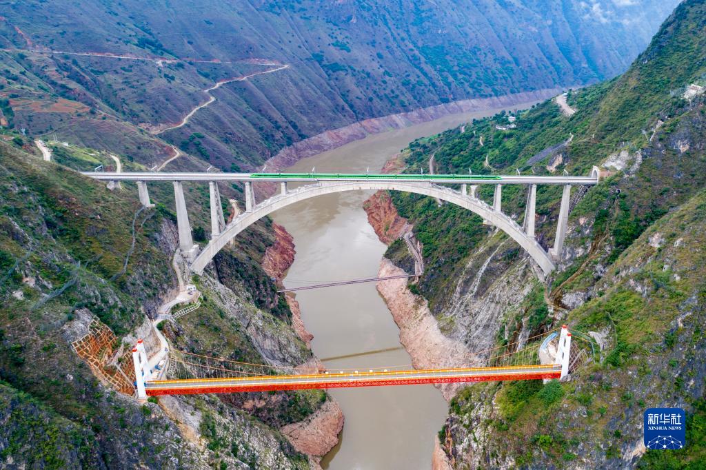 复兴号列车通过大瑞铁路大保段澜沧江特大桥,红色桥梁为中缅油气管道桥,下方为霁虹桥,呈现三桥并跨澜沧江景观(2022年7月22日摄,无人机照片)。新华社记者 陈欣波 摄