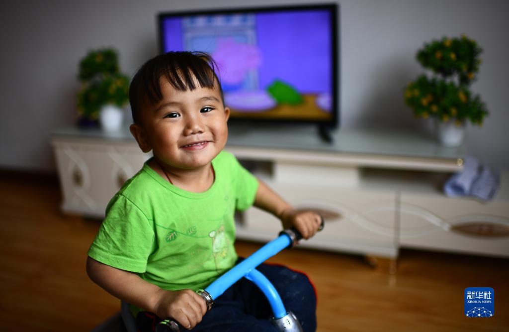 在青海省黄南藏族自治州河南蒙古族自治县易地扶贫搬迁安置小区幸福家园,智后茂村牧民旦却卓玛的儿子罗藏智华在家中玩耍(2018年6月13日摄)。新华社记者 张宏祥 摄