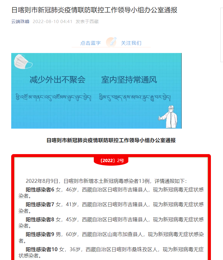 2022年8月9日,日喀则市新增本土新冠病毒感染者13例,详情通报如下: