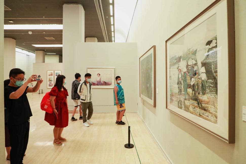 展览自开幕以来,吸引了大批观众前来参观,很多家庭带着孩子一起观展。展厅里,许多观众一边仔细欣赏画作,一边举起手机、相机拍照,有的还拿着画板现场临摹。