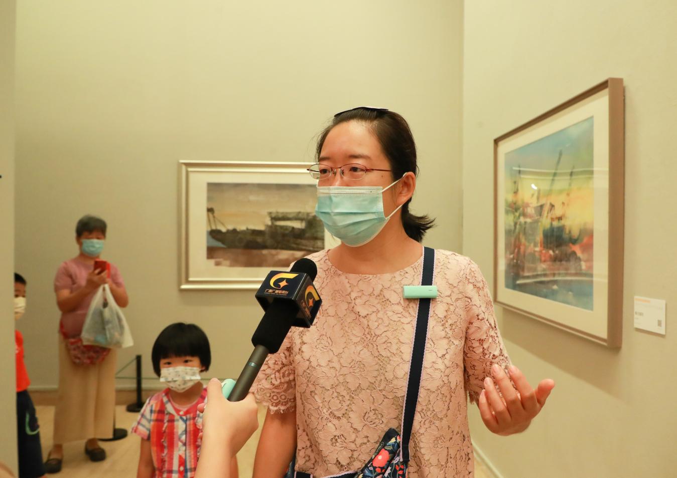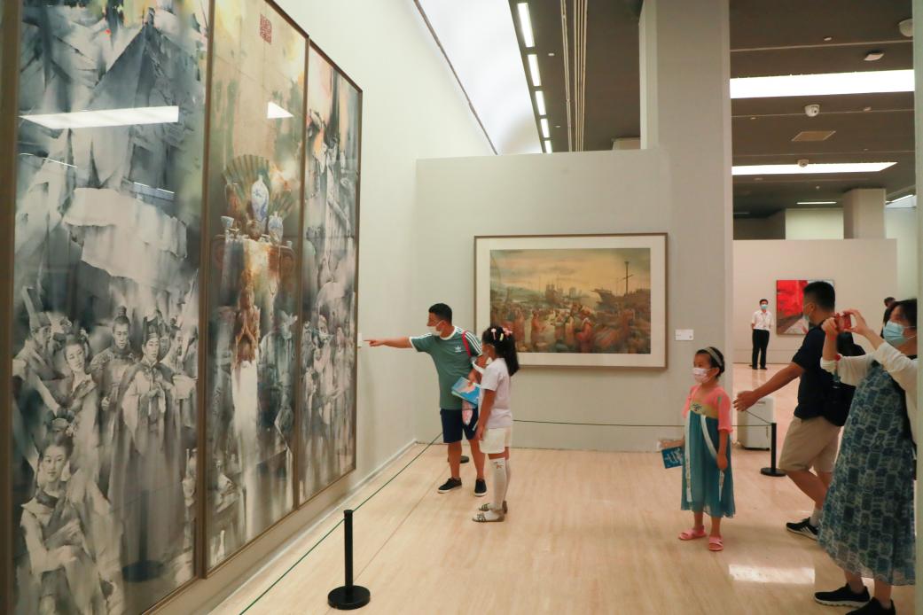 北京市民姬翔带着一对儿女,津津有味地观看张国楠的《归来鱼满仓》,感受北部湾渔民打渔归来的喜悦之情。她对此次水彩画展赞不绝口:“我虽然没有到过广西,但是通过展览深刻感受到广西的发展和变化,有机会一定要去广西看看。”