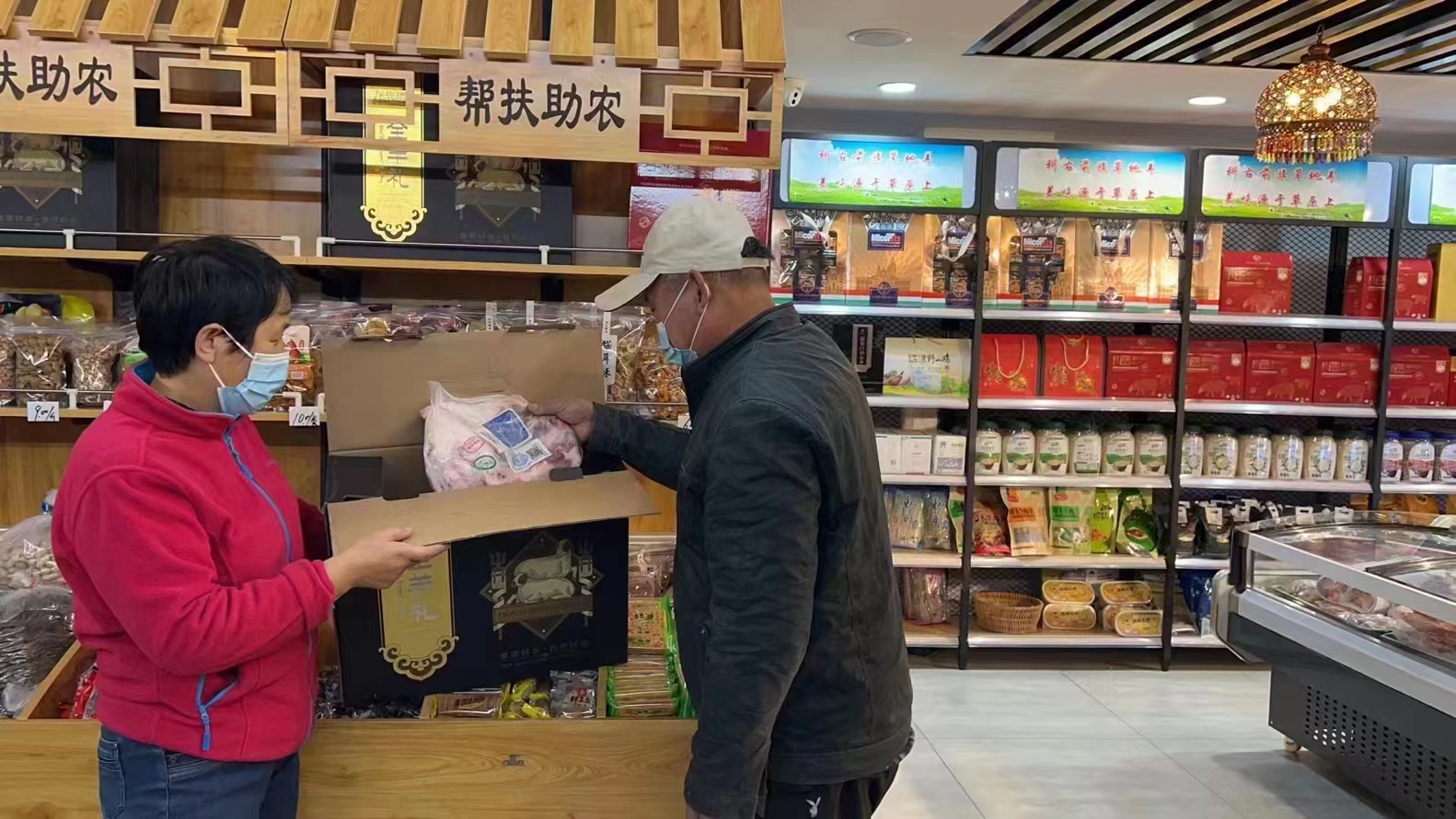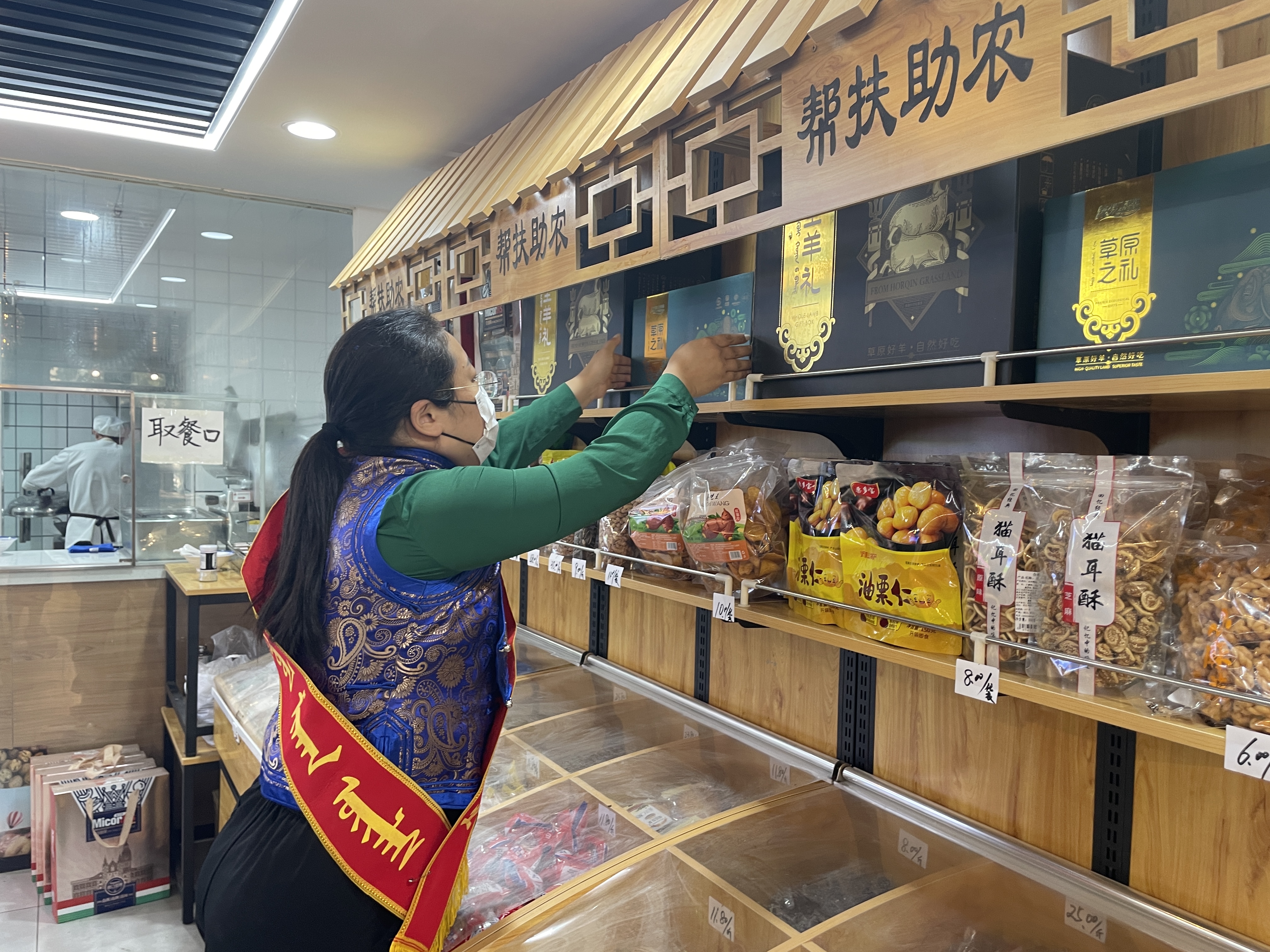 居民在店内可以看到琳琅满目的原生态农产品,有科右前旗黑头大尾羊在展示,包括包装好的羊肉、羊棒骨、羊腿、奶皮子、奶豆腐等产品展陈在冰柜内;货架上展示着粗粮小米、玉米、燕麦片;最引人注目的是写有“帮扶助农”货架上的“全羊礼”等各种奶制品。