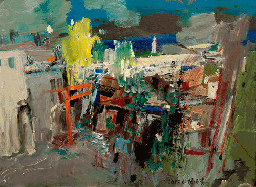红云下的朱家角(油画)80×120cm-2022年-张祖英