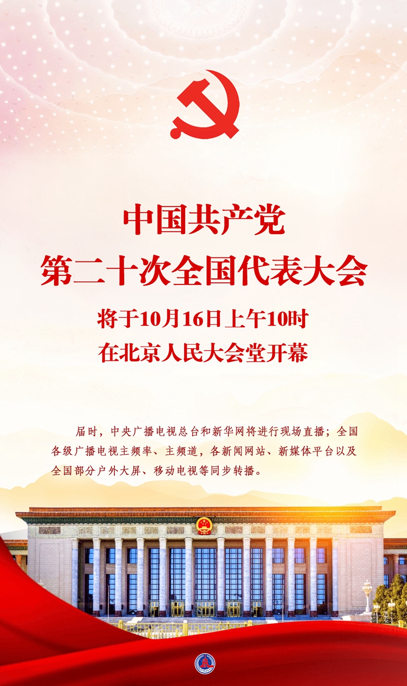 新华社北京10月14日电 中国共产党第二十次全国代表大会将于16日上午10时在北京人民大会堂开幕。