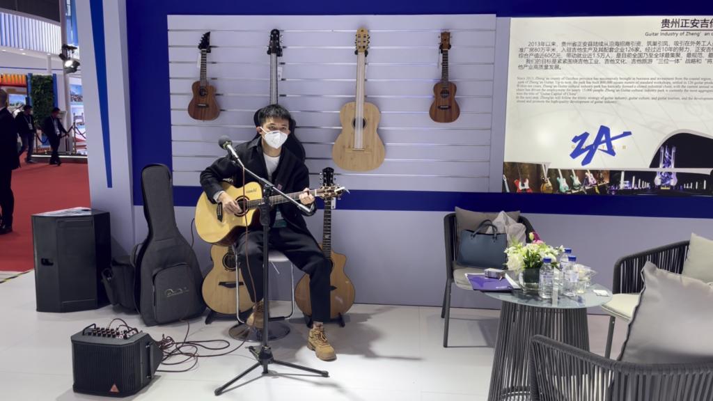 手指翻飞,琴声悦耳。在综合展示区贵州展台一隅,遵义市正安县经济开发区园区管理服务中心副主任田飞正用吉他弹奏具有当地特色的曲目。