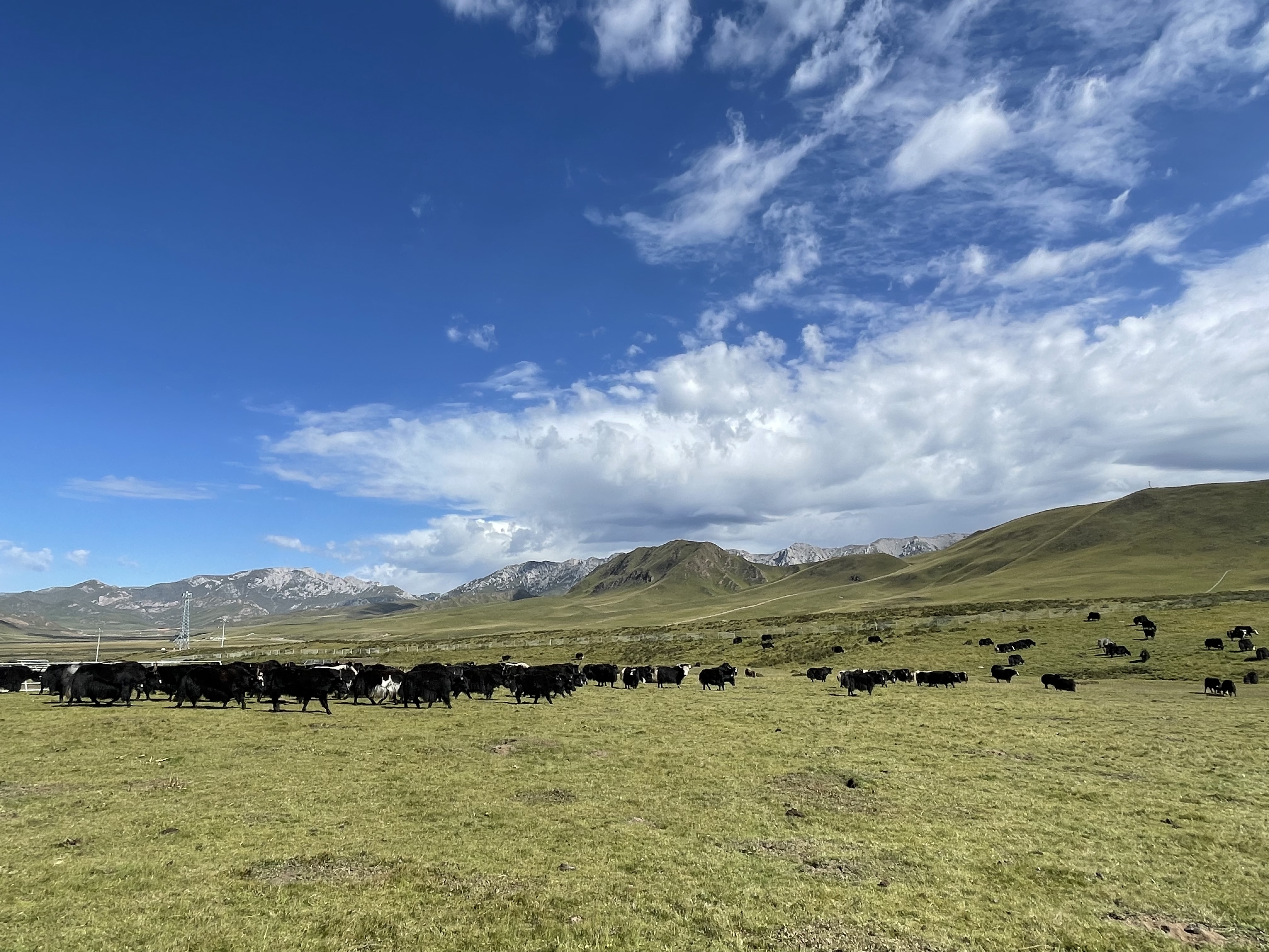 午后的阳光照在海拔3500米的草场上,三三两两的牦牛悠闲地吃草,在蓝天白云的映衬下,形成一幅独有的高原风光图。