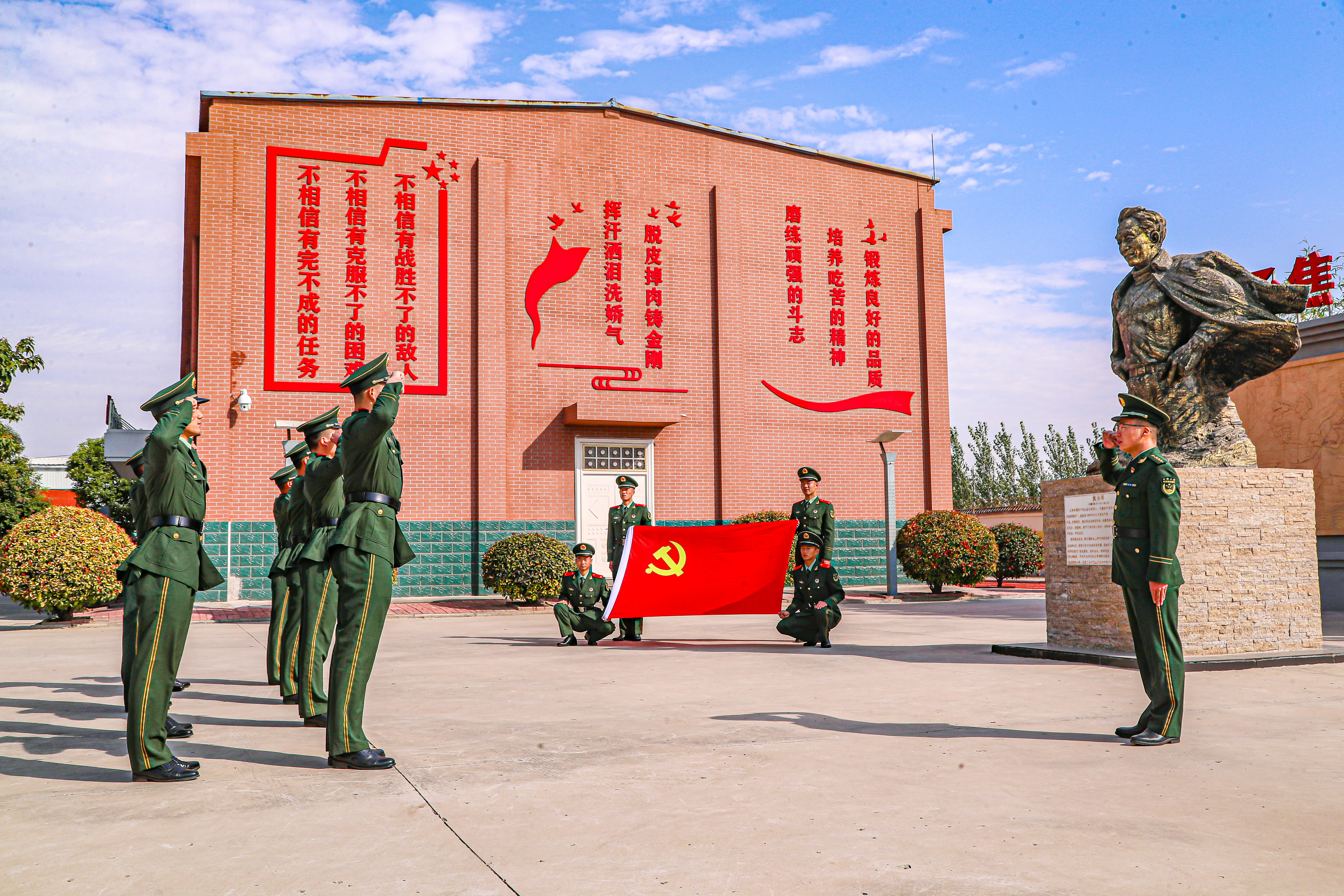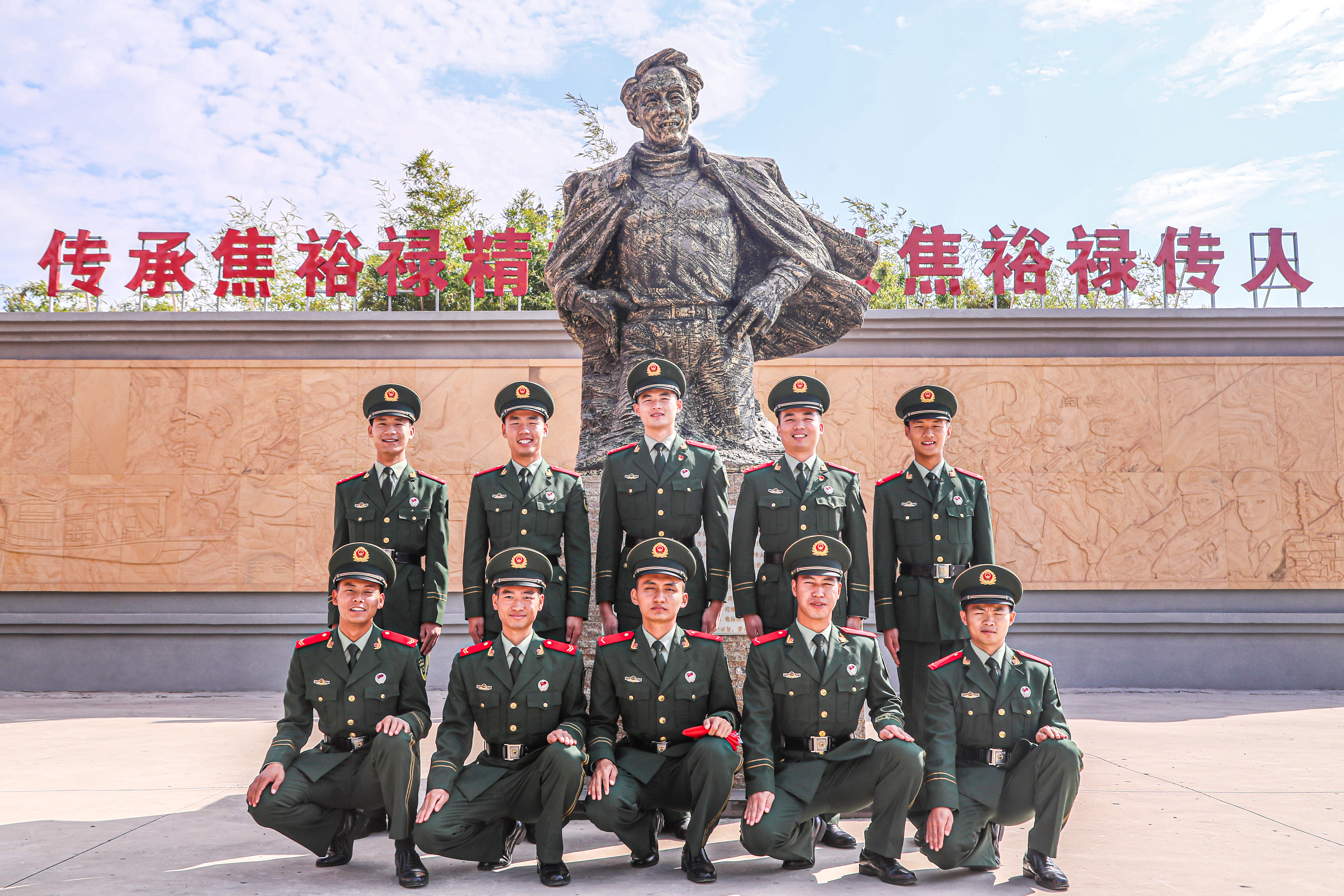 2022年10月17日,武警河南总队开封支队兰考中队开展“赞颂十年成就,奋进新时代”学习宣传贯彻党的二十大系列活动,图为中队官兵在营区内焦裕禄雕塑前合影。(谷珊、李永超、韩天宇、王国强摄)
