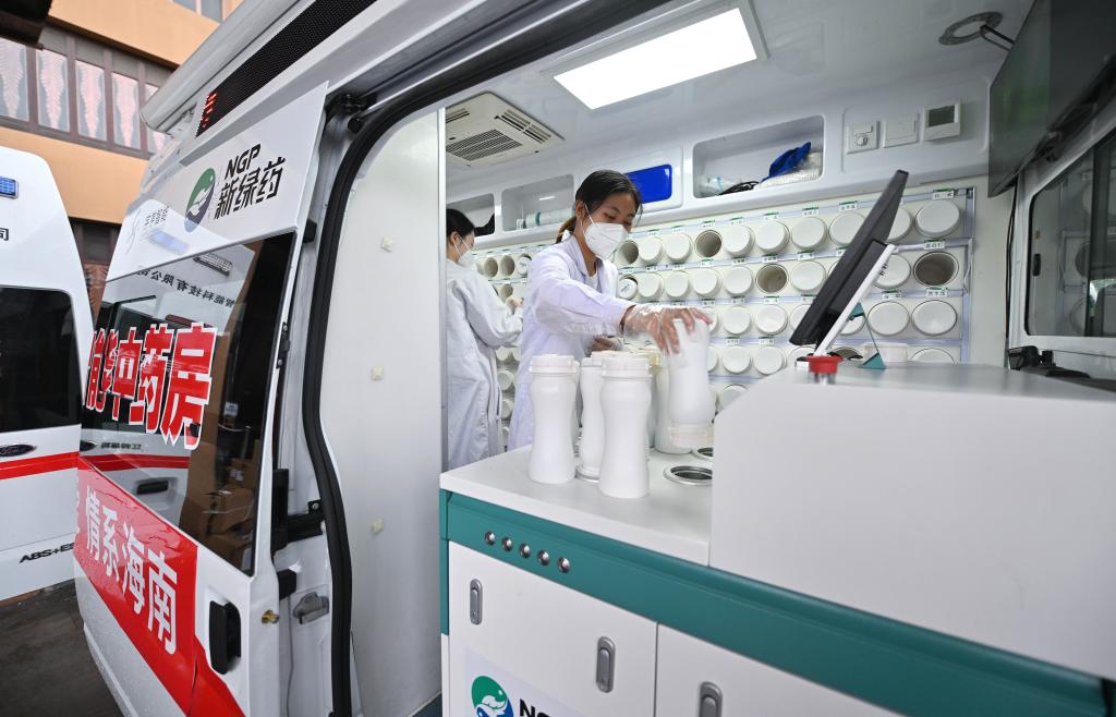 2022年8月20日,在海南三亚一家酒店附近,工作人员在“流动应急智能中药房”里将盛有单味中药浓缩颗粒的药瓶放入发药机。新华社记者 郭程 摄