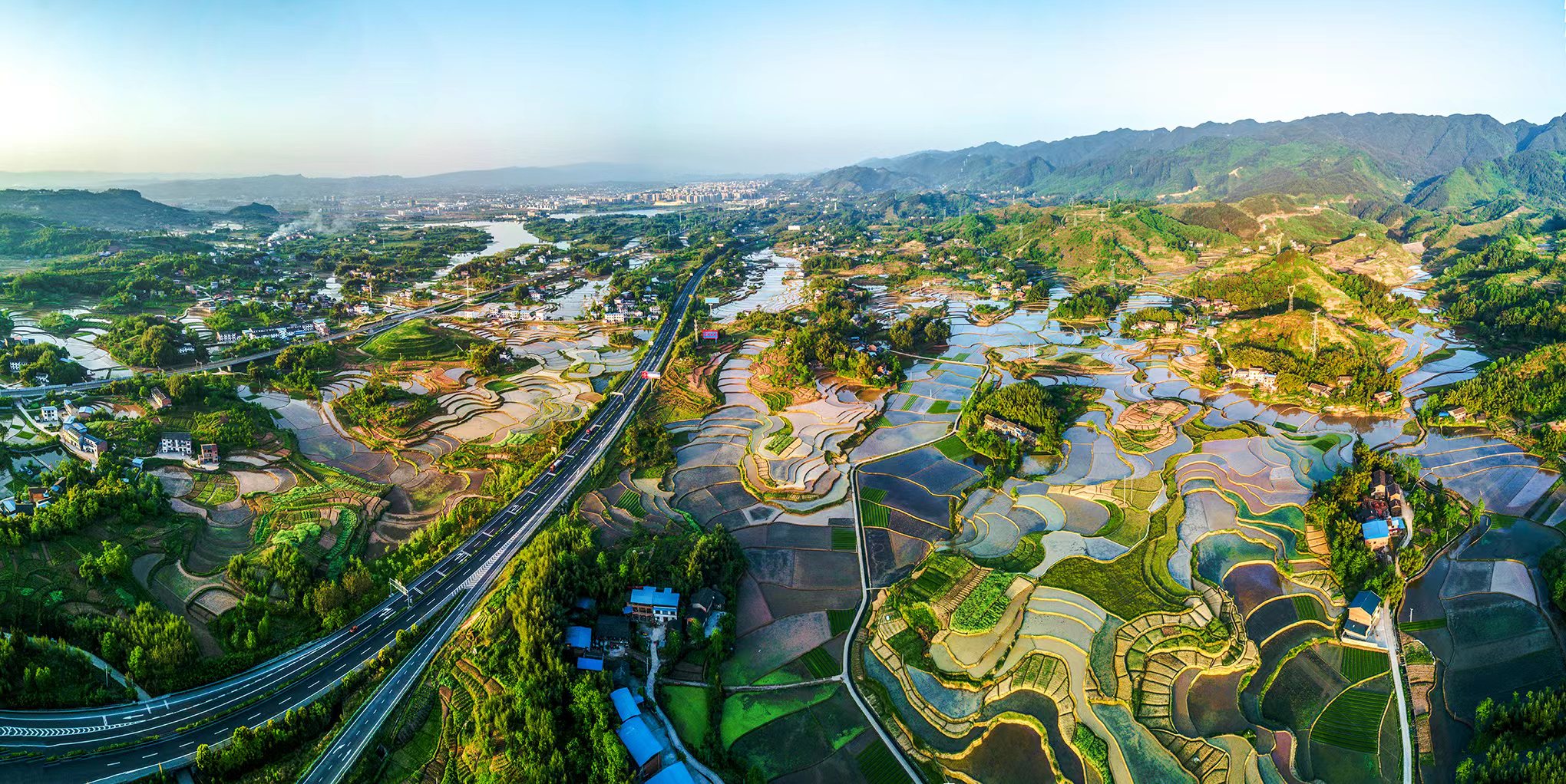 图片说明:重庆梁平湿地织锦,湿地、城市、高铁等和谐共生。 蒋胜斌 摄