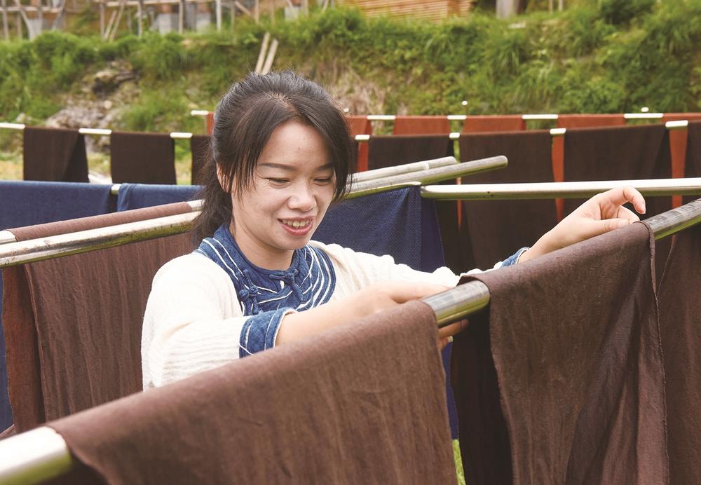 “2016年,我回家过春节,发现亲友家上好的侗布被堆放在屋角,不用也不管,我就发微信推销。没想到,几天时间,全寨的土布都卖光了。”由此,杨成兰毅然返乡织布染布,重拾童年记忆,焕发侗布生机。