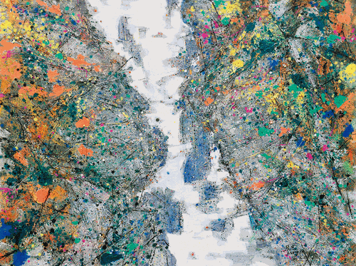 从风景意象层面来看,自然山水和城市景观无疑构成了张杰绘画创作中的两个重要向度。然而,画者对二者的认知并非线性的递进:一方面体现为从自然山水向城市景观的比重倾斜,前者呈现出渐隐的趋势;另一方面则体现为城市与自然两种视看方式的辩证交织,城市与山林基于视觉主义的调配形成一种交错式互看。如创作于2017年的“空城记”(竖构图)系列对2012年“破碎的风景”系列中,“两山一水”视看方式的借用—画者以“山水”的视角看城市。再如2020年的“追梦人”系列中,画面中“地面标线”所营造的构成感与2011年“被切割的风景”系列中线条切割的形式表现力相得益彰。