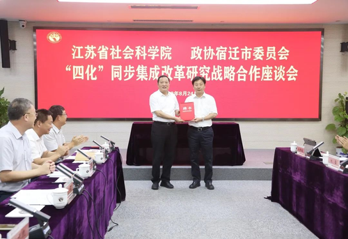 会上,宿迁市政协与江苏省社科院签订“四化”同步集成改革研究战略合作协议,夏锦文获聘宿迁市政协“四化”同步集成改革智库特聘专家,双方将围绕共建“四化”同步集成改革宿迁研究基地、共同开展课题研究和人才培训等方面开展深层次合作。