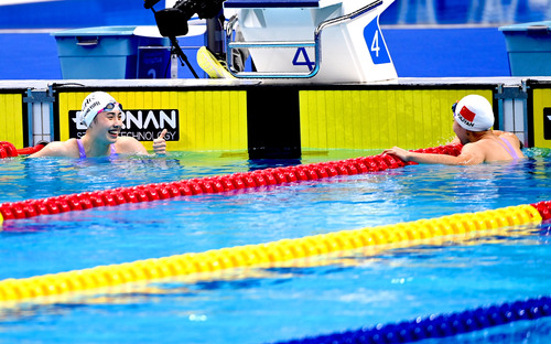 女子200米蝶泳决赛中,终点张雨霏在给俞李妍点赞