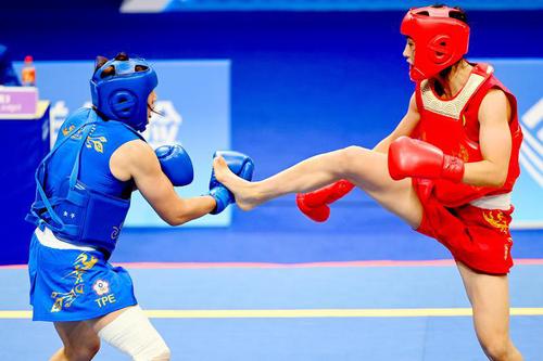 散打女子60公斤级四分之一决赛,中国队选手(红方)吴晓微在比赛中。(记者 田福良 摄)