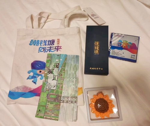 遮阳帽、加油棒、小国旗,镜头里每一位欢呼的观众都备齐了这三件,引起记者的好奇。询问后得知,每一位入场的观众都收到了亚运观赛礼,除了刚才的三样,里面还包括钱塘区特色旅游地图、地标书签盲盒和随机手工针织小物。