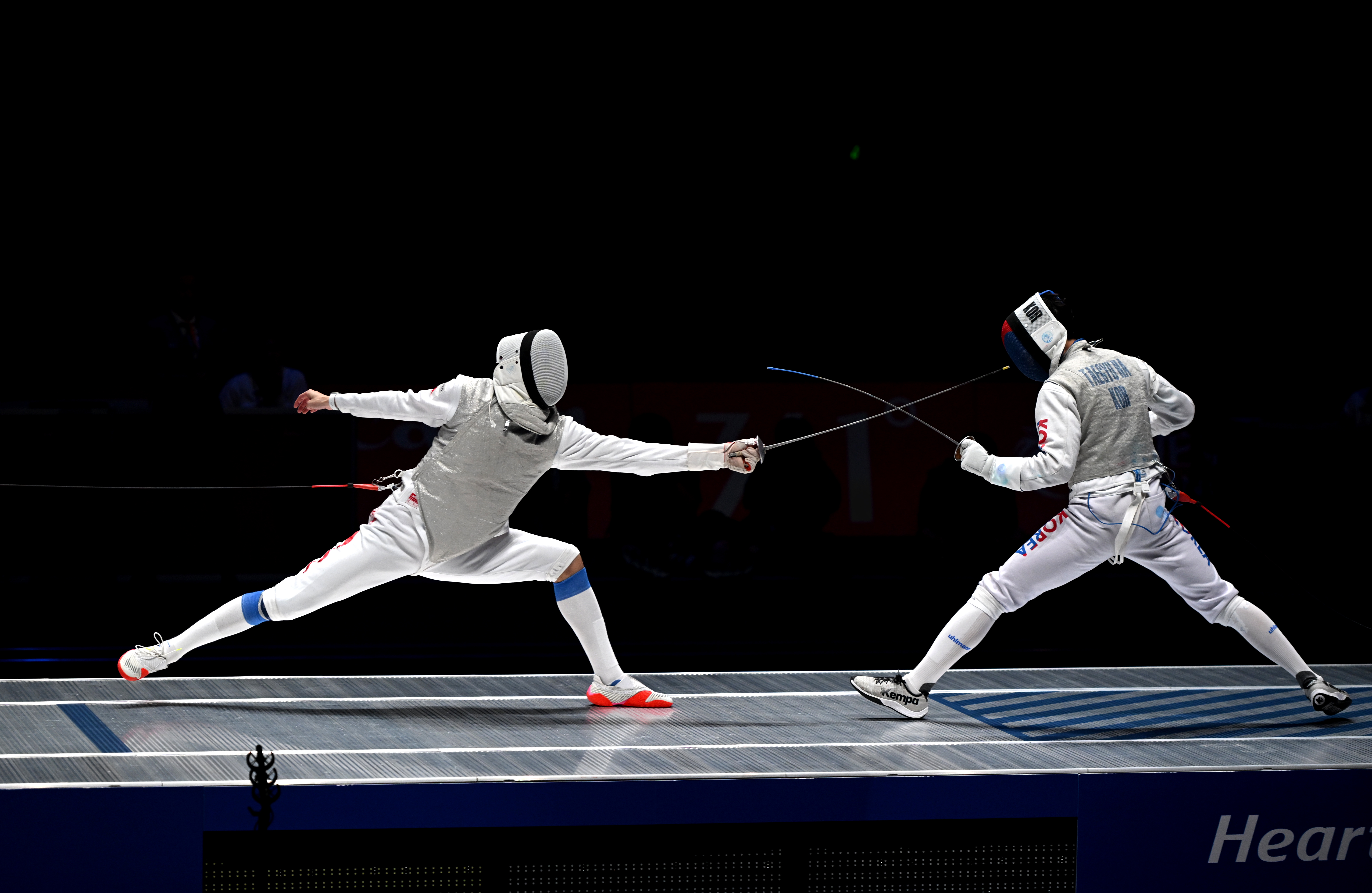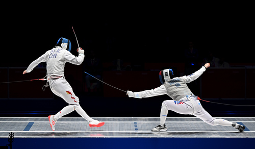 图为中国选手(左)在男子团体花剑决赛中。