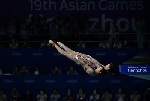 在紧随其后的杭州亚运会男子双人3米跳板决赛上,何超、严思宇这一“老带新”组合也展现了超高的技术水平和默契,就连正式起跳前丢毛巾的动作也出奇一致,逗笑了不少在场观众。最终,他们以总分422.55分的成绩夺得冠军,为中国跳水队揽入“第二金”。