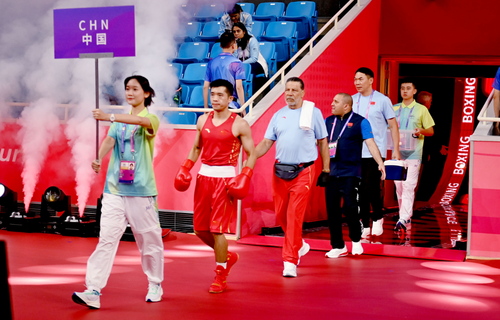 亚运会拳击男子57公斤级比赛中,中国选手来自贵州的运动员吕平进场比赛。
