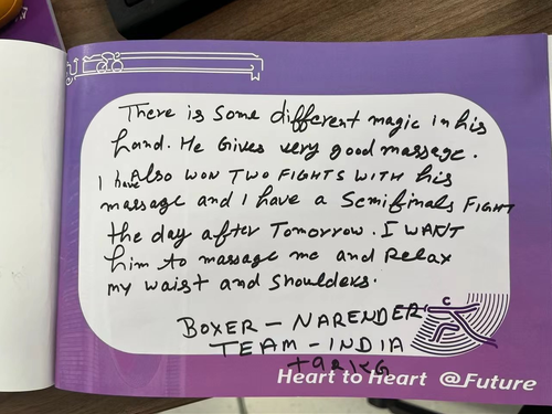 纳伦德心满意足地离开服务点,同时还留下了一封手写信。每次看到这些文字,吴珏灿心中就充满了感动和自豪,“收获运动员的认可,我们每位医生都很激动。我本人也喜欢研究运动医学和传统中医技术的结合,从经验来看,在国际赛事上反响还是不错的。”吴珏灿表示,“中国传统文化博大精深,它包罗万象,包容性、结合性特别强,我们文化自信的‘底气’很足。”