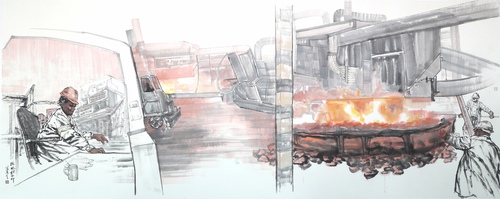 中国美术家协会范迪安主席看了这组作品后说:“这可是一件大作品!你下了大功夫,整体很丰富,场景很有气氛,节奏感也很强。”并题字“走一带一路 谱钢铁新篇”,刚劲有力、气韵神逸的书法作品为其助力。中国工业绘画的发展伴随着中国社会发展历程的时间晴雨表。自二十世纪五六十年代开始方兴未艾,当时中国版画家协会主席李桦先生提出过“中国工业版画”。把工业题材的绘画放在了一个突出位置,工业绘画是随着社会发展进步而发展的,当今正进入了在一个不同画种与不同艺术表现力交错的发展过程,工业绘画具有时代、行业、 题材及艺术的特征。作为艺术工作者 ,需要深入厂矿、车间,真实体验感受工作气氛和生活环境,收集酝酿素材进行构思构图,进而创作出生动感人而恢宏的作品。 随着现代工业科技创新智能化发展, 怎样把艺术与科技的表现与人文思想融入绘画当中,是一个值得去探讨创新的课题。