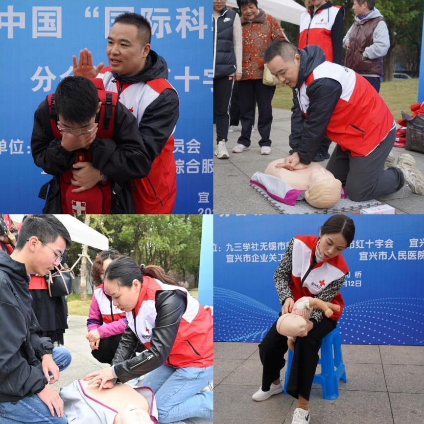 为弘扬科学精神,传播和平理念,宜兴市企业关工委综合服务团团员、市红十字应急救护培训师、宜小红志愿者在现场发放宣传手册,并进行应急救护知识讲解和实操演练,展示心肺复苏和气道异物梗阻的正确救护方法,围观的群众表示学习自救互救的知识有好处,纷纷上前学习海姆立克法、心跳骤停实地施救法。
