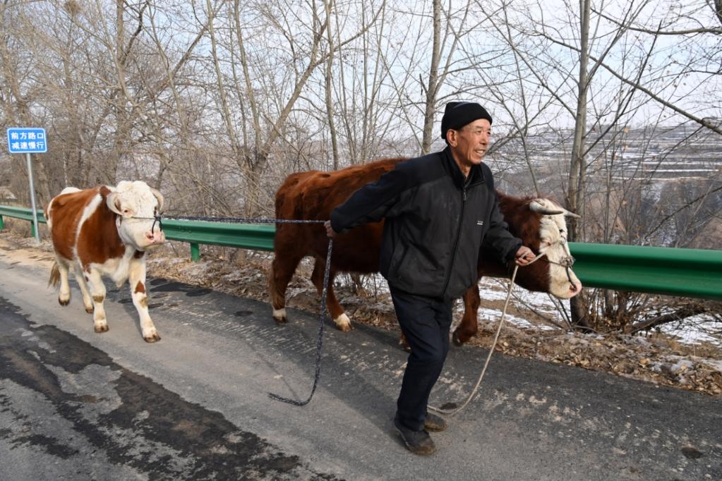 12月23日,在积石山县石塬镇秦阴村,曹学礼在村道上放牛。新华社记者范培珅 摄