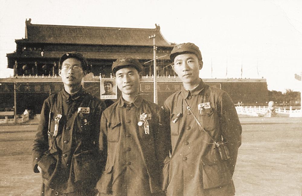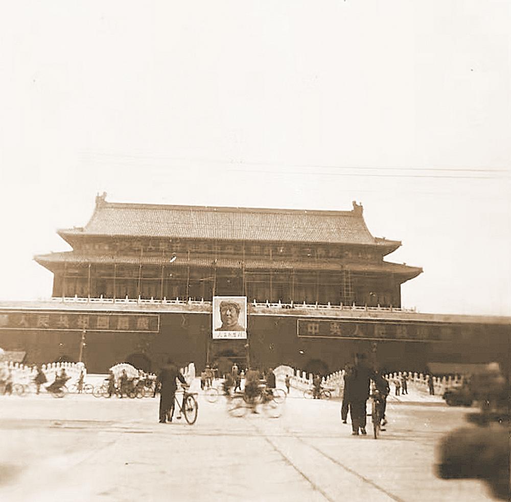 1949年9月30日,华北画报社摄影记者杨振亚、吴群、林杨在天安门前的合影,能看到天安门城楼的毛主席画像下面写的是“人民的胜利”。