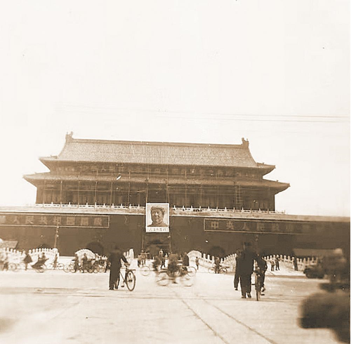 ▲1949年9月30日,华北画报社摄影记者杨振亚、吴群、林杨在天安门前的合影,能看到天安门城楼的毛主席画像下面写的是“人民的胜利”。