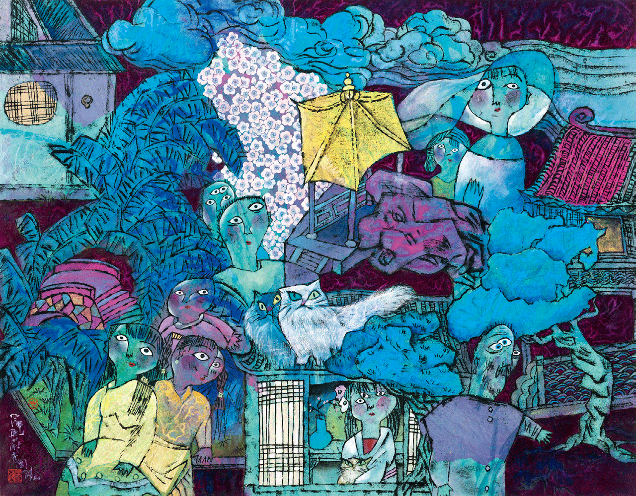 邵飞1980年代始创作“山海经”题材绘画,她注重将民间神话传说、志怪故事与西方现代艺术观念共冶一炉。邵飞认为民间美术作品中,蕴藏着最可贵的至真至纯至善至美的情感,蕴藏着人与万物共生共长共荣共享的无限生机。就像她1986年根据《山海经•海内西经》文“开明兽身大类虎而九首,皆人面,东向立昆仑上”创作的彩墨画《九头人面兽》,以彩墨涂绘出背景的玄幻之气,九头人面兽则是悬浮于空中,其身上立有一人形精灵。邵飞用墨线刻画出九头人面兽的身体轮廓和虎纹横线,其形态既有阴山岩画凿刻法的单纯亦有剪纸拼贴的朴质,形象完全是自由生发、臆造而成,极具想象力。同年创作的《多梦的夜晚》则又有所不同,很多莫可名状的幽灵像是被时间的黑洞扭曲着,就像是弗洛伊德心理学中描述的被白日理性意识压抑的潜意识,在其进入梦境时,所有潜意识中的委屈、紧张、不安种种情绪都在漩涡中被释放出来,向梦的主人倾诉着自己的幽怨。这些画作既源于《山海经》文本或民间神话传说、志怪故事的激发,又源于邵飞内在意识中追求“随心草”般的自由驰骋之意象。应该说,邵飞在创作上试图摒除“我”的存在,是以“无我”“空白”的状态进入,让形象在画面上自由生长。