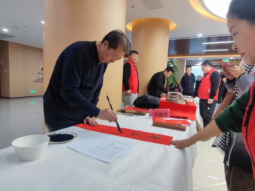 新时代,立足新起点,担负起新的文化使命。1月10日下午,由民进山西省委会经济委、民进山西省联合支部、山西民进企业家联谊会、民进山西开明画院联合举办的送春联进护理院暨“文经”沙龙交流活动在太原市举行。来自经济、文艺、教育界别的会员为太原欣宁护理院老人们送去丰富多彩的文艺节目,书画家现场铺纸研墨,即席挥毫,把一副副春联和一个个“福”字就呈现在大家面前。活动期间,主办方还邀请文史专家以根祖文化为题作专题讲座。图为会员和书法家为大家现场泼墨,书写春联。(本报记者 王泳摄)