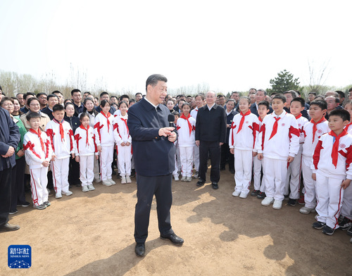 4月3日,党和国家领导人习近平、李强、赵乐际、王沪宁、蔡奇、丁薛祥、李希、韩正等来到北京市通州区潞城镇参加首都义务植树活动。这是习近平同少先队员在一起。新华社记者 李学仁 摄