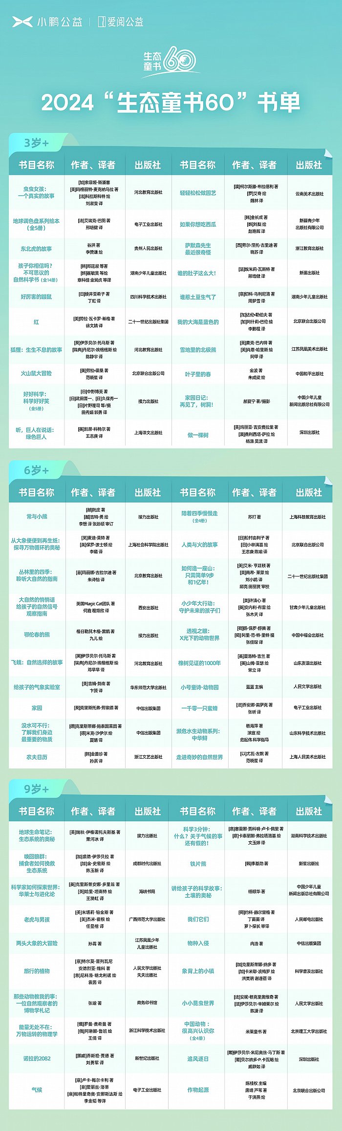 气候危机带来的全球气温上升、极端天气频发等现象,正影响着人类的健康和生存环境,儿童既是最脆弱的群体,也是改变的希望所在。如何让孩子更好地理解气候变暖、生物多样性丧失等现实危机,提升他们保护生态环境和应对气候危机的能力,受到全社会的高度重视。小鹏公益与爱阅公益希望这份书单能引发儿童及其父母在阅读中思考并重建人类与生态环境的关系。据了解,“生态童书60”是小鹏公益和爱阅公益连续三年共同发起的公益项目。过去两年“生态童书60”书单得到了教育、出版、媒体、企业和公益等各方的关注,促成各方跨界合作。