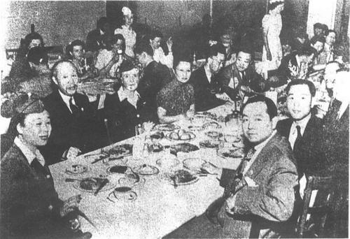 ▲1945年4月,董必武出席联合国成立大会招待会。正后排左一为董必武,左五为章汉夫。