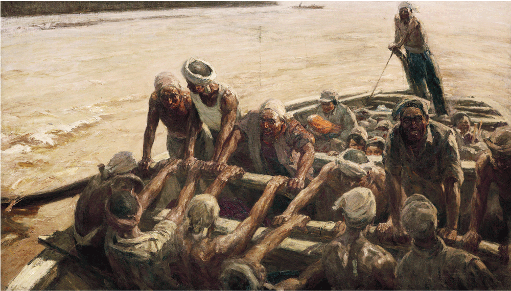 钟涵早年求学于清华大学建筑系,1955年,26岁的钟涵考入中央美术学院油画系学习,受教于艾中信、李斛、韦启美、董希文等先生。作为新中国艺术教育体系培养出来的第一批油画艺术家,钟涵在艺术生涯的开端便将目光放在了与他紧密相连的土地上。二十世纪五十年代,作为学生的钟涵曾参与三门峡的建设。在接下来的几十年间,他也曾多次至黄河写生。黄河不仅是他的艺术母题,多年来在黄河边见到的人与事也和他有着极深的情感连接。黝黑的纤夫、奔腾的河水、火热的号子……这些形象常常出现在钟涵的创作中。他感动于黄河船工的坚韧,曾说:“黄河船工有一种寓意性,在我看来,粗重的体力劳动如同民族的脊梁一样,曾经支撑起人民共和国初期的工业化基础,其灿烂至今如同昨日夕阳下的晚潮。”
