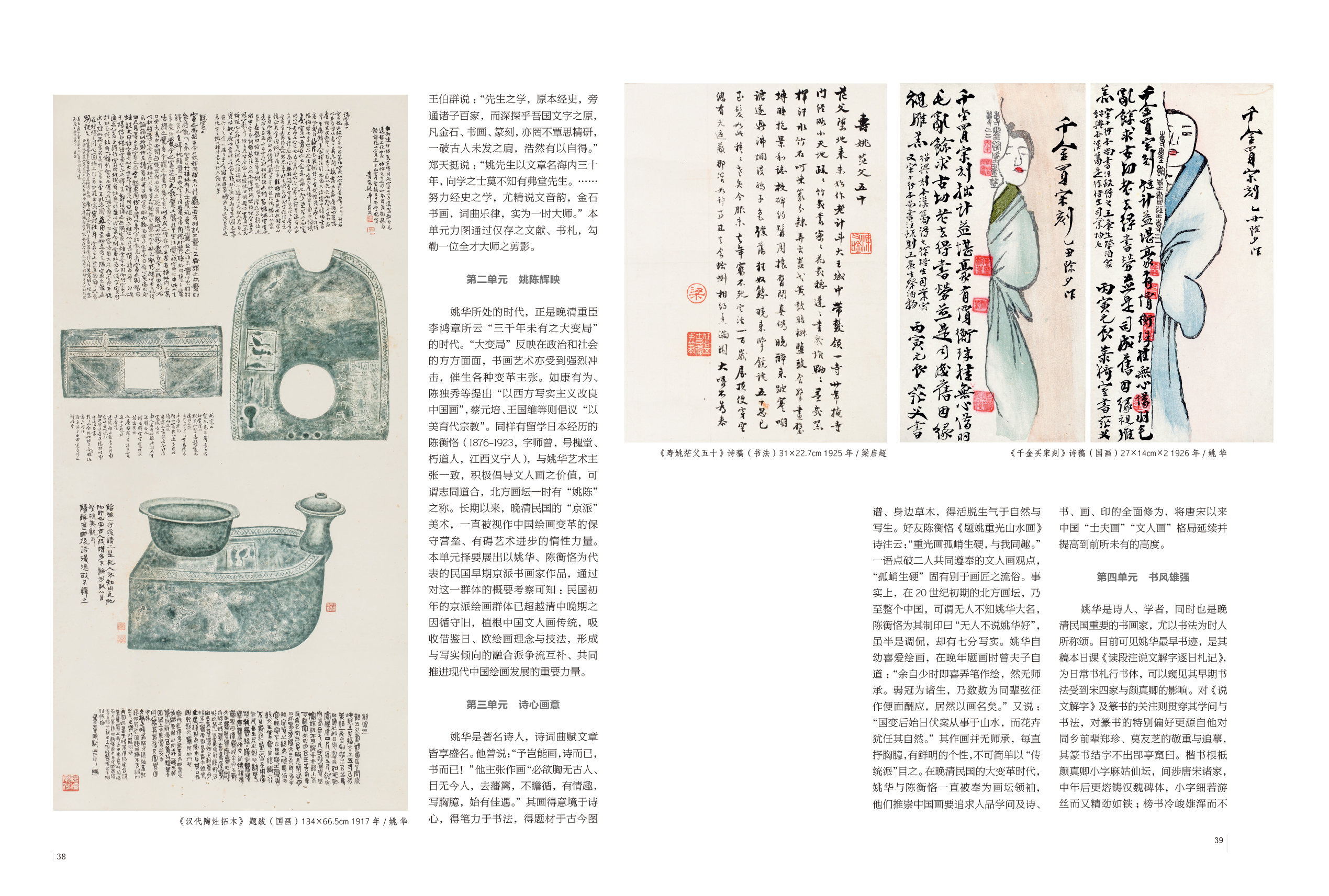 刘海粟曾说:“(贵州)近四百年来,风气渐开,名人辈出,兼擅画、书、诗者,于古人必称杨龙友,于今人则咸推姚茫父先生。”此真知者之言。姚华是清末民初黔中乃至全国著名的诗、书、画“三绝”的艺术大师,在文字学、音韵学、考据学、金石学、诗词曲赋、戏剧理论、画史画论、颖拓、笺纸、铜刻文房等诸方面皆卓有建树,被时人宗威誉为“当代之通人,艺林之耆硕”,被后人视为与王国维、吴梅“鼎足而三的一代曲学大师”。其弟子王伯群说:“先生之学,原本经史,旁通诸子百家,而深探乎吾国文字之原,凡金石、书画、篆刻,亦罔不覃思精研,一破古人未发之扃,浩然有以自得。”郑天挺说:“姚先生以文章名海内三十年,向学之士莫不知有弗堂先生。……努力经史之学,尤精说文音韵,金石书画,词曲乐律,实为一时大师。”本单元力图通过仅存之文献、书札,勾勒一位全才大师之剪影。